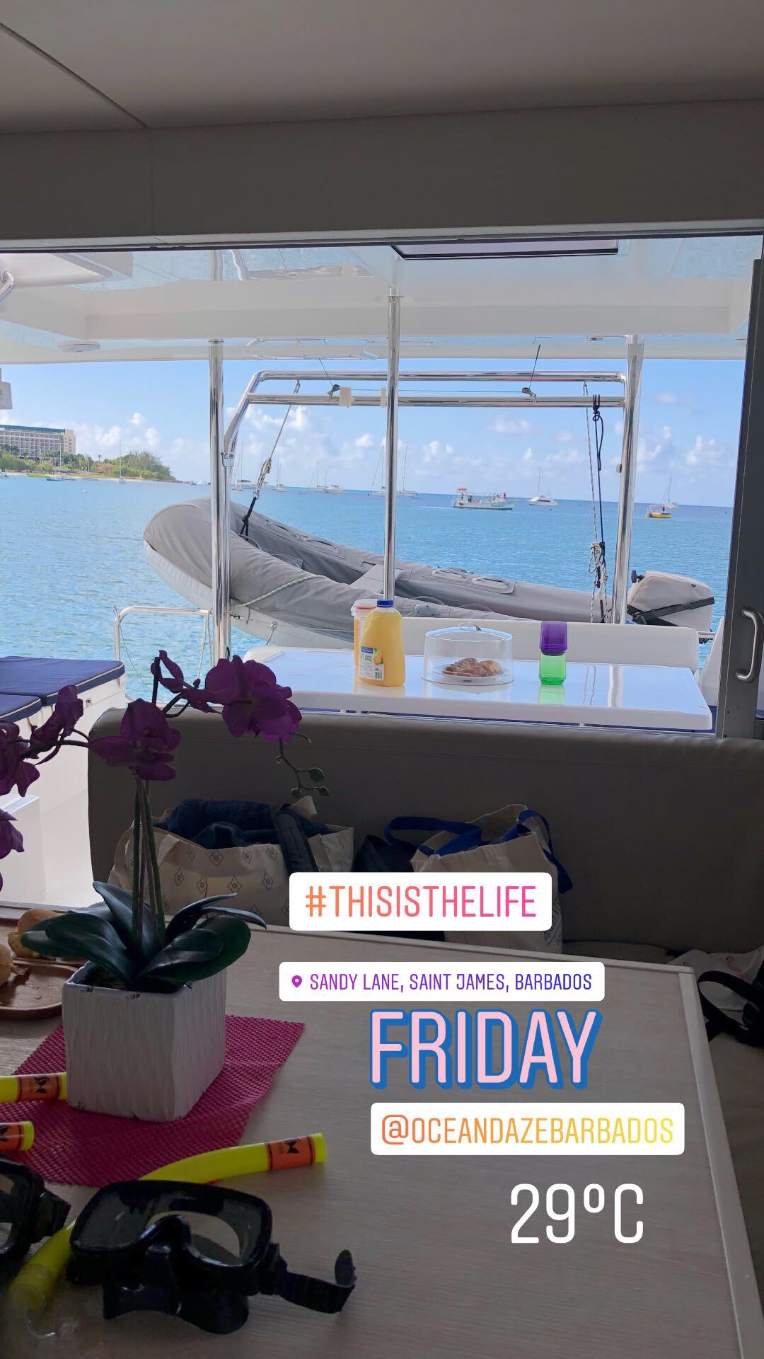 This year in Barbados I treated us to a trip on a private yacht with Ocean Daze, a company affiliated somehow with the famous Boatyard. This boat trip was like no other boat trip… we will definitely go again. It was expensive, very expensive, but so incredibly worth it. Nothing was too much for the crew, we were spoilt rotten. Picked up at the dock gate, driven to the catamaran, served breakfast, allowed to sit wherever we wanted on the boat and were served endless food, canapΓ©s, treats, cocktails, drinks whatever we desired all day long. We anchored off A beautiful beach, to spend some time relaxing, swimming, using the paddle board and inflatables. Then had lunch served, prior to sailing back to Bridgetown.