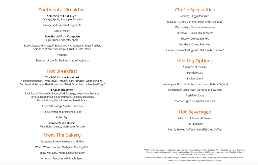 If your eyes are bigger than your stomach or youβd prefer a more refined breakfast you must head to one of the main dining restaurants for your breakfast. The Peninsular or Oriental restaurants are open from approx 07:30 til 09:30 depending on port or sea days. Youβll be seated on a table size of your choice (if youβre not a morning person you can always request a table for two) and you can then enjoy a table service of breakfast. Perhaps try one of the breakfast dishes of the day, or treat yourself to your favourite cooked selection.