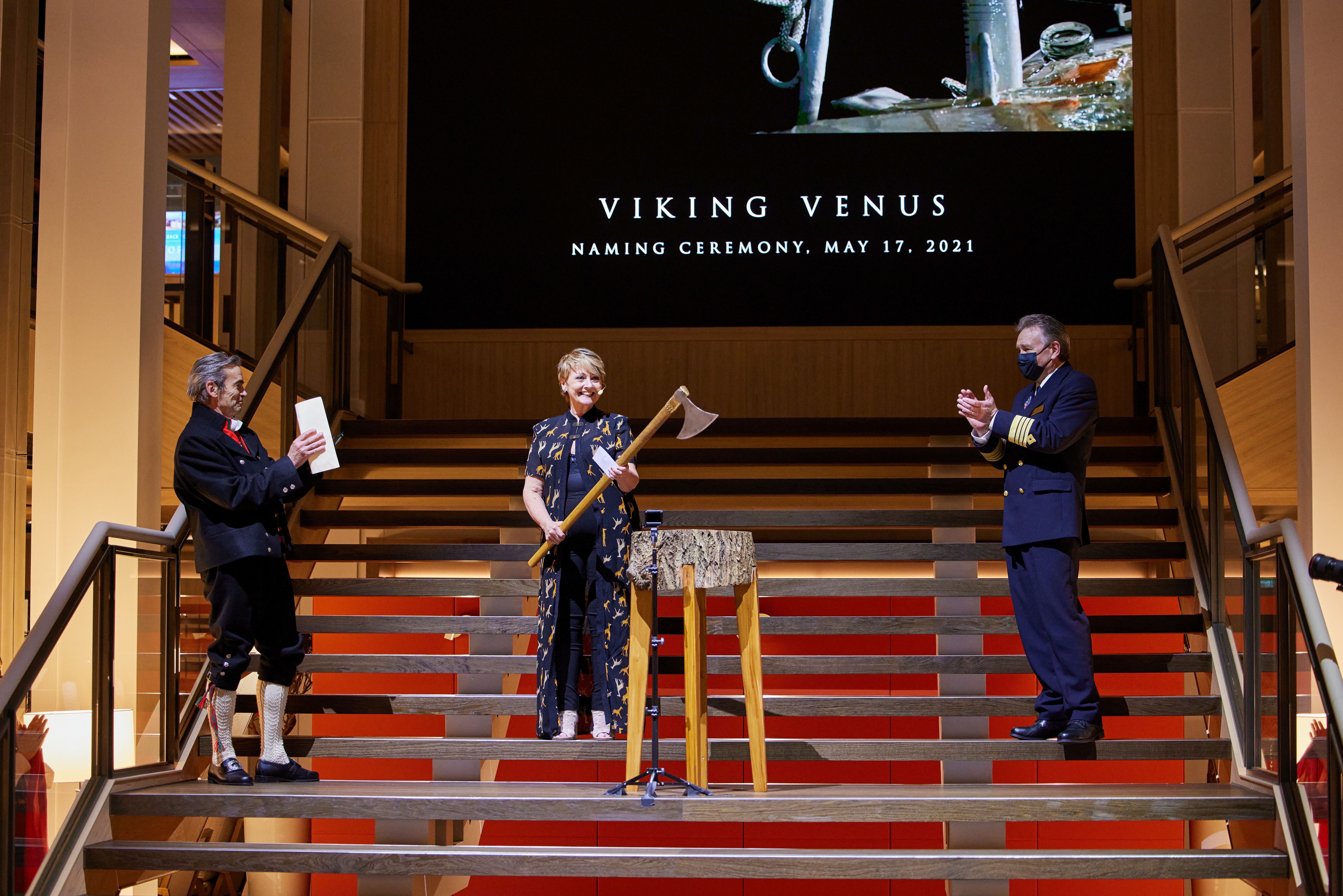 During the naming ceremony festivities this evening, the group of invited guests on board Viking Venus enjoyed scenic sailing along the coast of England, and exclusively recorded concerts from artists that included Sissel Kyrkjebø, one of the world’s leading crossover sopranos and godmother of Viking Jupiter; violinist Tor Jaran Apold; and acclaimed English boys choir LIBERA. In keeping with the naming custom, Anne assisted in breaking a bottle of Norwegian aquavit on the ship’s hull—using an historic Viking broad axe to cut a ribbon that symbolically held the bottle in place.