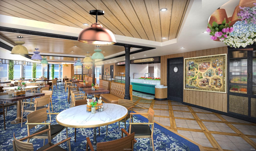 The whimsical design is inspired by the seaside boardwalk setting featured in popular โMickey Mouseโ animated shorts, a fitting addition to the Mickey and Friends-themed family district on the upper decks. A sizable, shaded seating area will provide convenient and comfortable accommodations for families to relax and enjoy their meals.