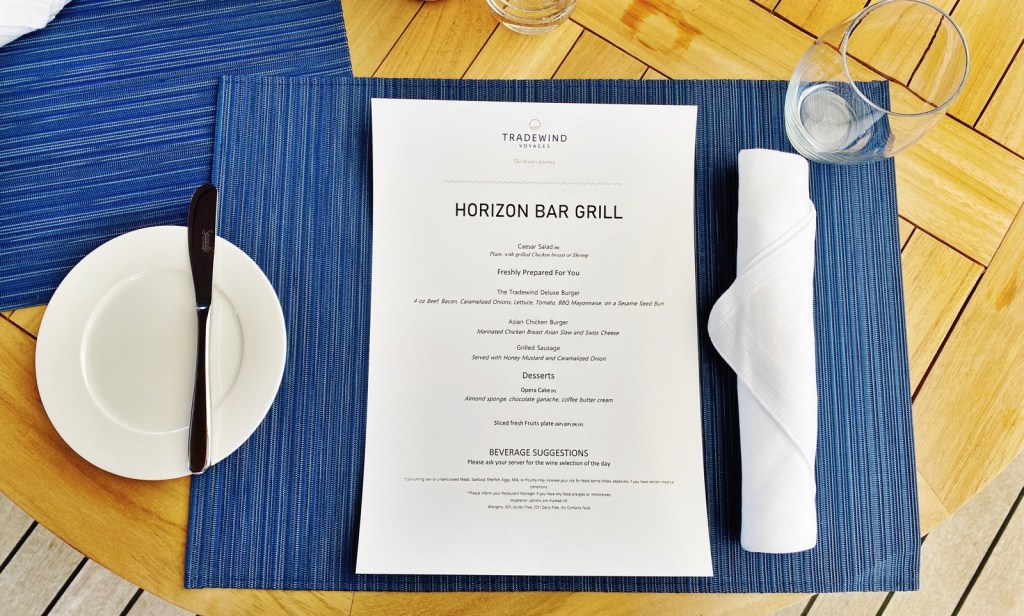 From the piano bar there were swing doors out to the Horizon Grill Bar. We spent a lot of our cruise in the Horizon Grill bar. A lovely area with ample seating, a mix of high fixed stools around high tables and normal height tables with comfortable cushioned wooden deck chairs. Lunch and Dinner could be eaten in the Horizon Grill. The menu was slightly more casual dining than the dining room menu, equally as delicious. The menu in the Grill didnt change over the course of the cruise. In the evening the menu was, it may come as no surprise, that of a grill, Grilled Chicken, Fish and Steak were offered. We took a few lunches outside in the Horizon Grill, mainly because we could sit down there with our swimwear cover ups and not need to go inside to change for lunch.