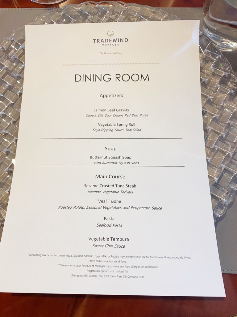 Tradewind Voyages formal spiel on dress codes is : β During the day (both aboard and ashore) the dress code is casual and comfortable, including shorts, jeans and sturdy shoes for walking tours. Naturally swimsuits, brief shorts, cover -ups and exercise attire are fine for the poor side and gym. For dinner, we suggest a smart casual outfit. Jacket and ties are optional for the men. Shorts and open toe shoes are not considered appropriate for dinner.β I have to say I did notice a few of the older men in shorts for dinner, however until reading Tradewind voyages dress code statement and seeing it was in fact not allowed, it hadnβt bothered me in the slightly, they all appeared to be in smart shorts. My husband mostly wore chinos with a shirt and I wore either a dress, or a sparkly top with very dark smart jeans. There are no formal nights aboard Golden Horizon. However I wore a dress aboard that I would sometimes wear on a formal night, so if you want to dress up and cruises are youβre only chance to, then you dress up, you would not feel out of place.