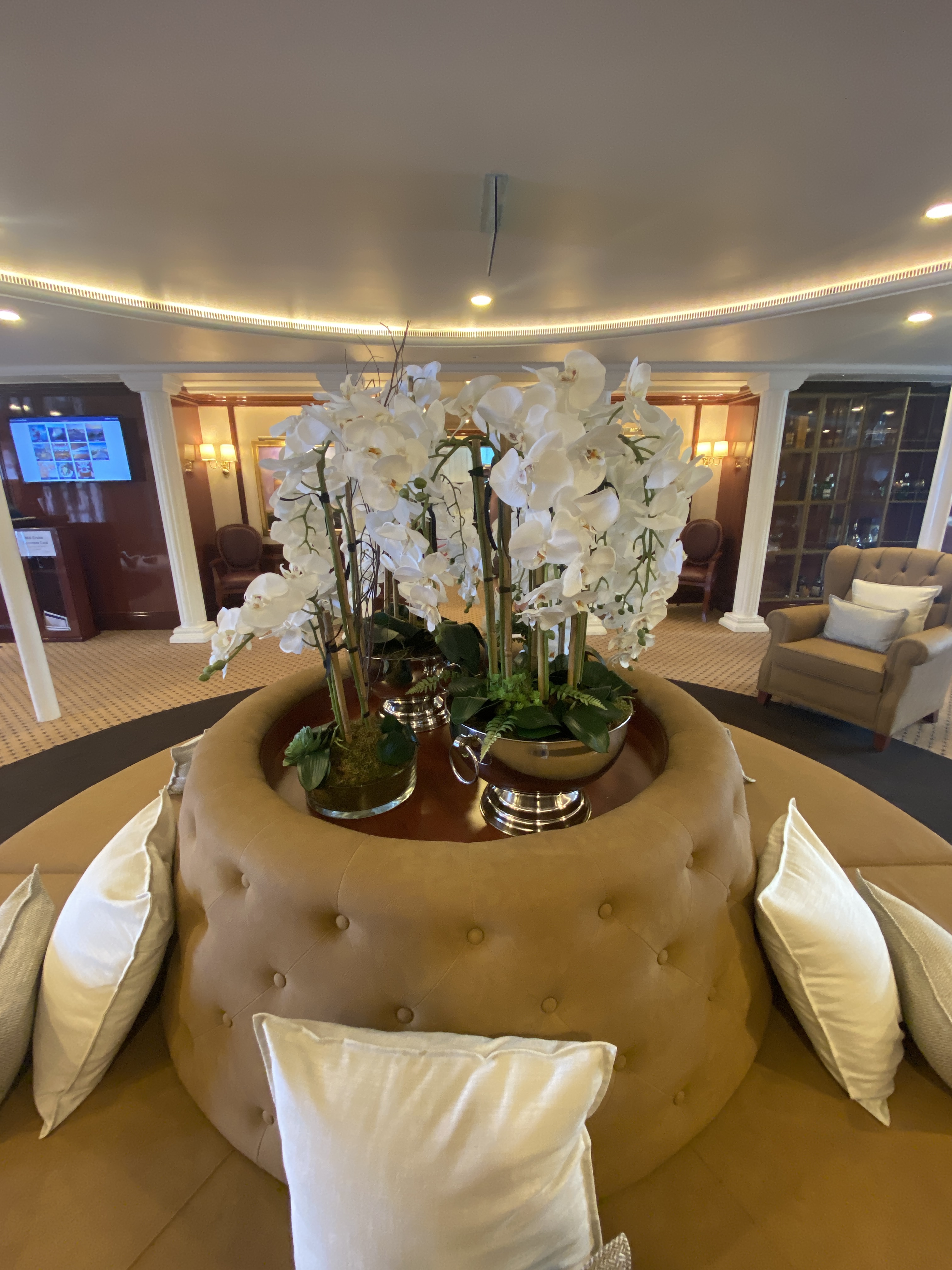 When leaving the Dining room on the Gallery deck you enter into the Reception area of the ship. This area has a lovely country house club feel about it. Comfortable armchairs, cosy sofas all around a central circular sofa containing lots of beautiful orchids, I didnt touch to see if they are real or not.