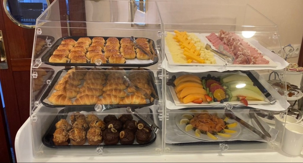 When we embarked, we had missed lunch, so had some afternoon snacks, served from 16:00 – 17:00 in the piano bar in a served buffet style. These included savoury bites and cakes and scones. Delicious on our first day, as we were hungry, but we had absolutely no room for it on subsequent daysβ¦ there was no shortage of food aboard.