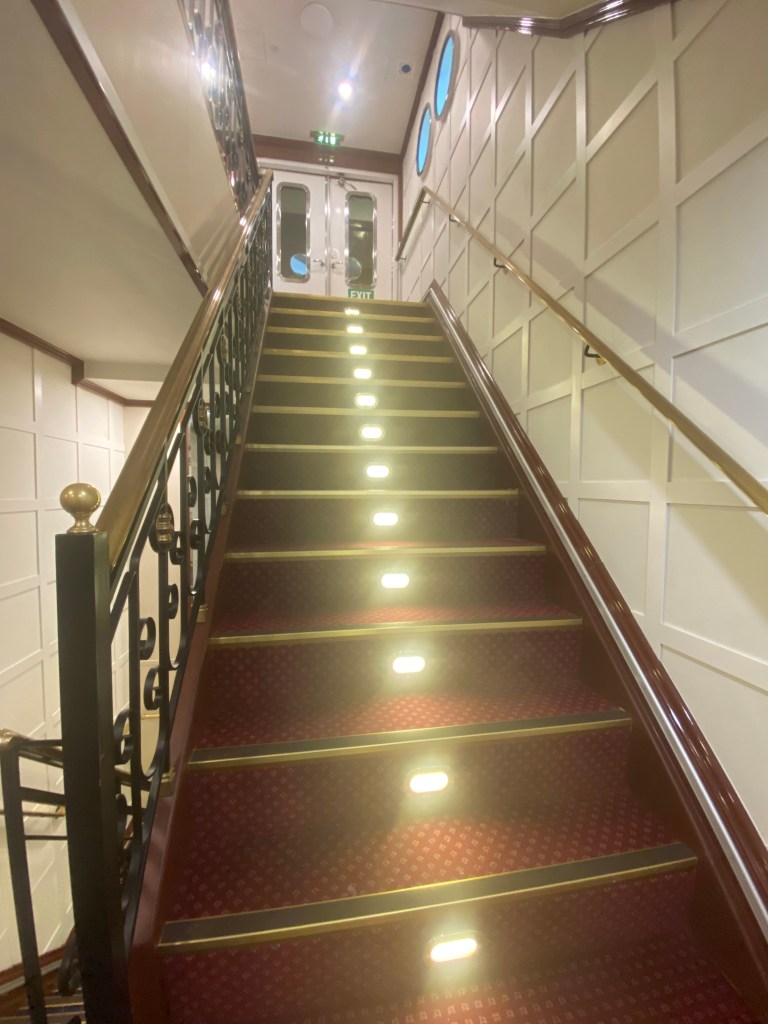 Food in the Main dining room was absolutely delicious, Service was brilliant too. The Breakfast menu had plenty of choice of different ways to break the overnight fast. Lunch in the main dining room consisted of a three course meal with plenty of choice! This stair case is quite steep and I imagine could be a challenge for anyone on rough seas. Handrails are on either side to ensure you travel up and down safely.