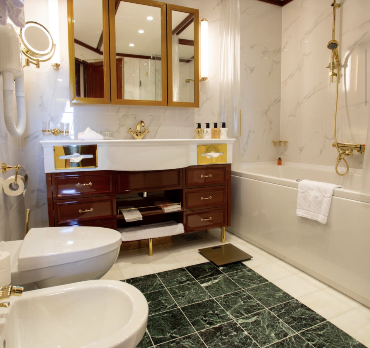 Whilst on the subject of Cabins, the Deluxe Balcony cabins, on Main deck, consist of a Balcony, double or twin beds, a sofa bed to sleep one adult or two children. A deluxe bathroom with shower over the bath. 24 hour room service, complimentary mini bar, luxury suite amenities and twice daily housekeeping. Deluxe cabins can accommodate 4 guests, as long as 2 are children.
