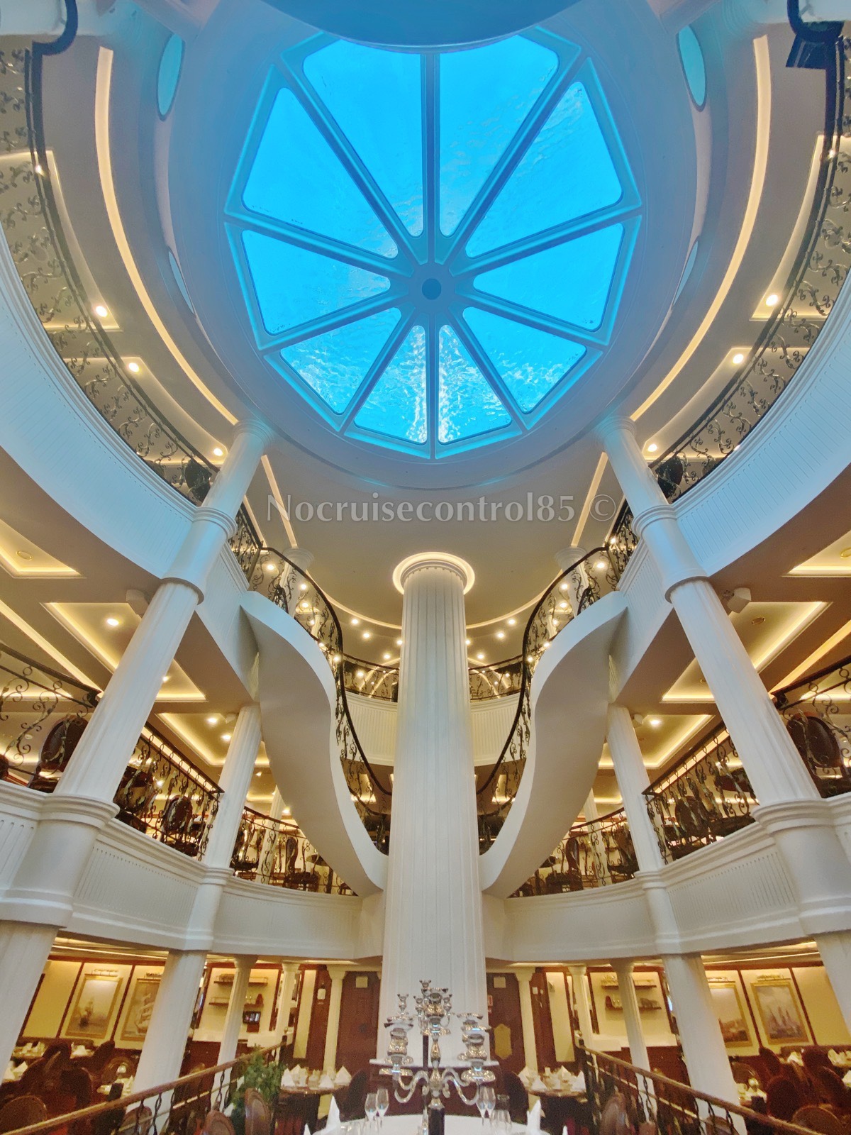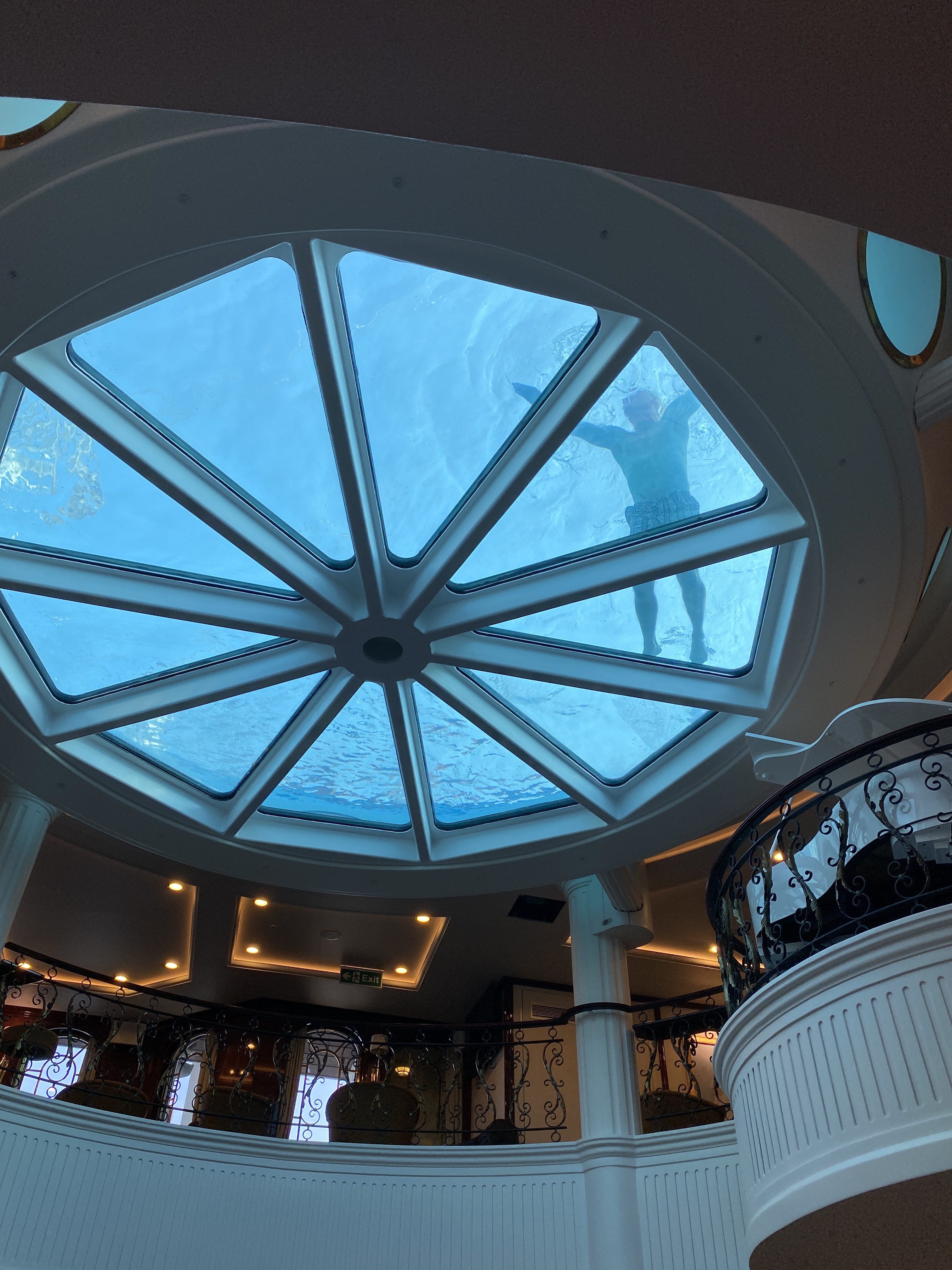 The shop then opens out into the Library. I love a library at sea, Cunard Line, Queen Victoria has to be one of my favourite Libraries at sea, however after seeing this one, its a hard toss up between the two! This library is spectacular. Plenty of comfortable seating dotted around, shelves full of books, atlasβs and a globe to plot your voyage route. Beautiful windows with a wake view, plentiful choice of brand new board games and playing cards. Perhaps one of the most unusual views in the library is a view which so easily could be missed. Ensure you look up, preferably when someone is diving in the dive pool! The ceiling of the library contains a circle of windows into the base of the dive pool. Definitely an unusual photograph to capture, a diver giving you the OK hand signal whilst youβre relaxing, reading a book!