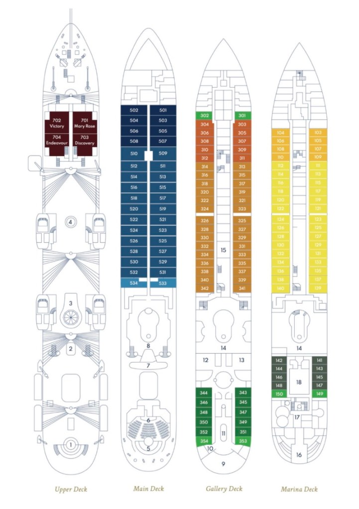 Golden Horizon consists of 4 passenger decks, Marina Deck, Gallery Deck, Main Deck and Upper Deck.