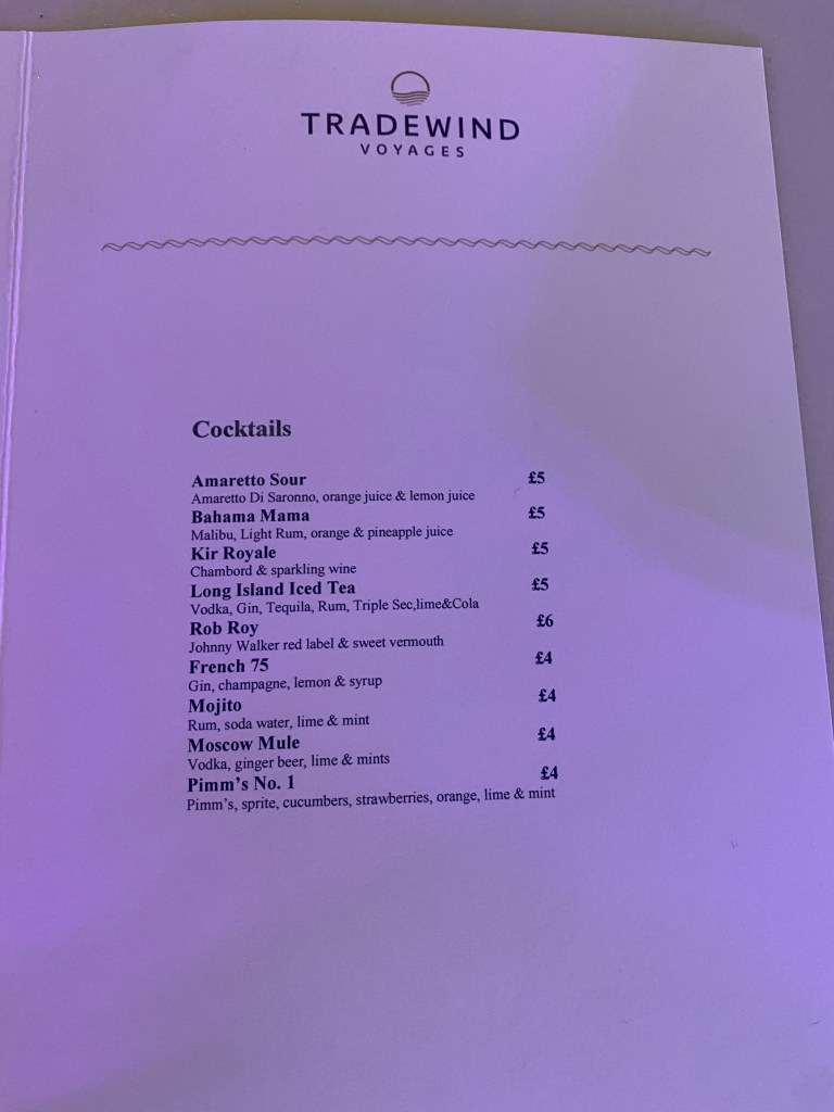 With the pre cruise communication and the on board service, Tradewind Voyages is an adventure best served to the relaxed, laid back, avid cruiser. Those of us blessed with the ability to go with the flow and see what happens. I think if perhaps you are more a highly strung soul, who needs an itinerary set in stone and a packed plan for the day, then a Voyage on Tradewind Voyages may test you. This is in no means a criticism. The relaxed, laid back way of life aboard, is perfection in our current world of rules and regulations to live by. For example, when we docked in Cowes, no decision was made until mid morning about if we were allowed ashore independently. In my mind, the decision was always going to be no, I had not expected to set foot in Cowes and took this voyage to explore the ship, not the ports. However, it appeared to come as a surprise to some. As has been the way over the last 15 months, many had opinions and many chose to air them to anyone who would listen. Alternatively if you had a burning desire to head to shore, shore excursions could be booked to leave the ship within an organised Bubble, much the same as other cruise lines cruising the South Coast this Summer.