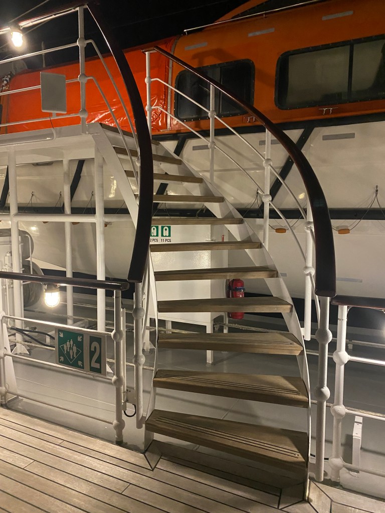 Upwards to Gallery Deck. Do note if you have any mobility difficulties then sadly Golden Horizon may not be the ship for you. Given her small, intimate, beautiful, traditional design, there is no room for lifts. The ability to climb up and down stairs is a necessity. Stair cases are steep. They all are quite narrow with the ability to hold either one or two rails as you walk. You would never need to walk from Marina deck up to the Upper deck in one go, unless you wanted to. There are plenty of places to rest, if you needed to. We were blessed with calm seas for our voyage. Extra care would need to be taken if the ship was rolling, but it is all good fun, isnβt it!
