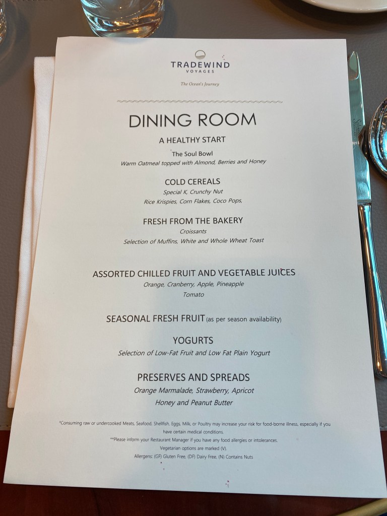 The restaurant itself seemed quite large, we always had a table for two , as most couples seemed to do. There were only around 100 guests aboard our voyage, so there was easily room for us to all eat at the tables we wished to. Breakfast was served in the dining room from 07:30 – 09:30, same timings for both port and sea days. The Breakfast menu was vast with plenty of choice for both the healthy breakfast fan and those more inclined to a treat whilst on holiday!