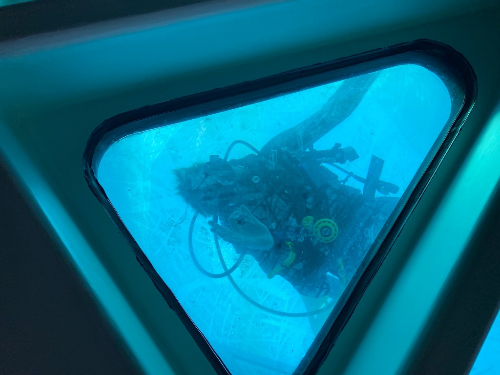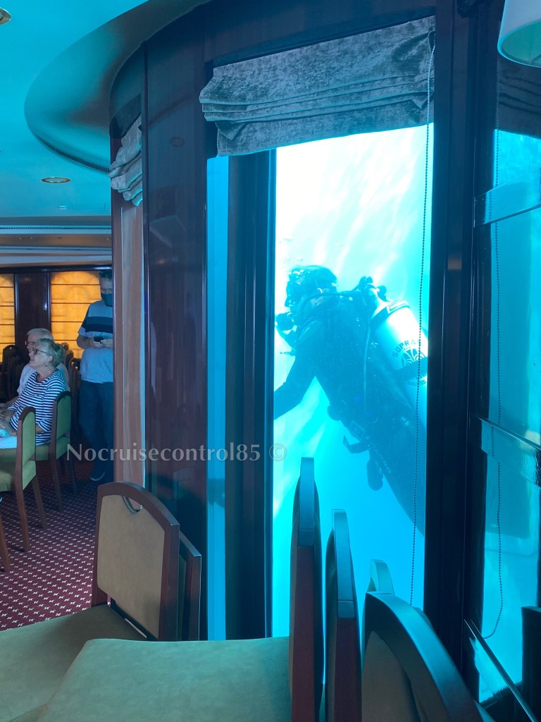 Golden Horizon has a resident Dive instructor , he can take guests on introduction to diving sessions in the Ships very own Dive Pool. Iβve been on many ships, but have never sailed upon a ship with its own 4 metre deep dive pool for Scuba Diving practice. The pool extends down from the Upper Deck down to the Main deck. It is almost aquarium like with base windows in the Library ceiling and side windows in the function room. It was quite the novelty realising someone was in the tank when both in the library and then the Function room on our first day aboard! I managed to attract Craig, the Diving instructors, attention whilst in the Library and received a divers ok hand gesture!