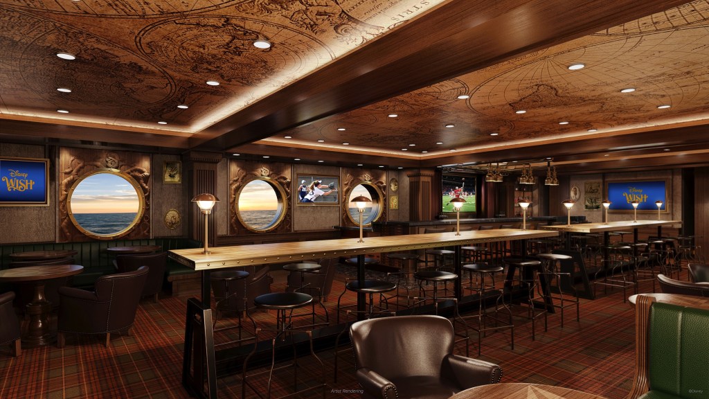 This casual setting is perfect for guests to kick back and watch live sports, news and major broadcast events while sampling a specialized selection of beers, including three custom craft brews available exclusively aboard the Disney Wish, along with an assortment of liquors, wines and cocktails.