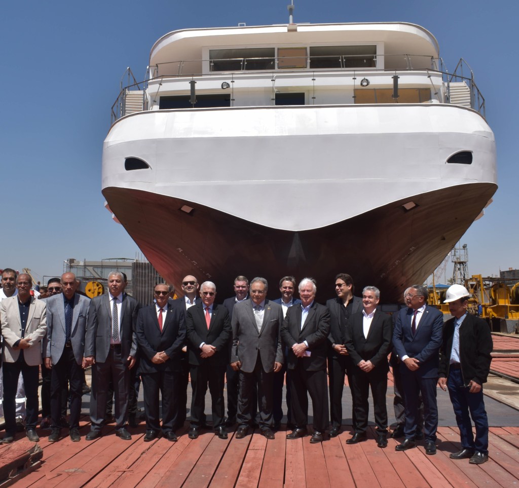 The traditional float out ceremony took place at Massara shipyard in Cairo on Tuesday, 4 April 2023, and is significant because it denotes a ship moving into its final stage of construction. The float out of Viking Aton began at approximately 1:00 p.m. local time when Viking Chairman Torstein Hagen and Sayed Farouk, Chairman of The Arab Contractors (Osman Ahmed Osman & Co.), together pressed the button that signalled to lower the ship-lift of the yard. She will now be moved to a nearby outfitting dock for final construction and interior build-out.
