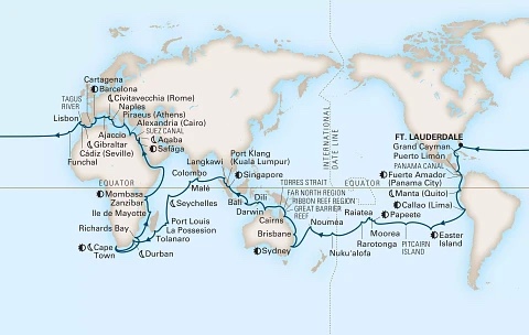 - Transits the Panama Canal and makes way to Easter Island before crossing the South Pacific to Australia. Explores the Great Barrier Reef en route to Indonesia and Sri Lanka, then sails south to Cape Town, South Africa, by way of the Seychelles, back up along the eastern coast of Africa, through the Suez Canal to Portugal before crossing the Atlantic Ocean.