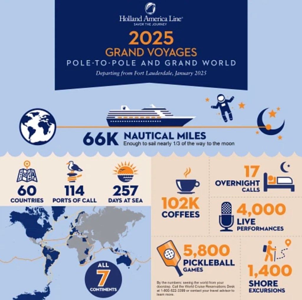 The combined Grand Voyages will feature more than 4,000 live performances, 1,400 shore excursions and 5,800 pickleball games β more than any two simultaneous voyages for Holland America Line.