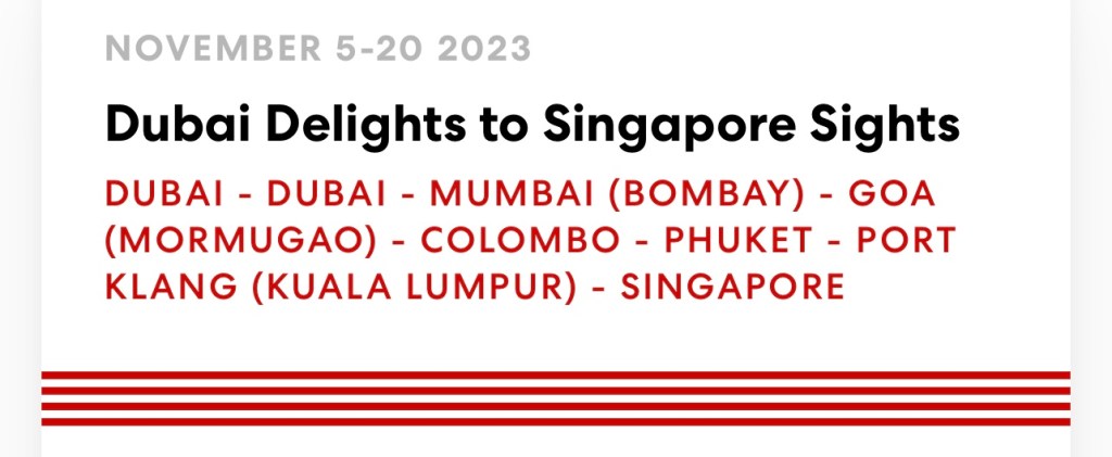 As someone with a Full time career outside of my Cruise Vlogging and Blogging interests, holiday time would not stretch to 6 weeks in one go, so I decided to book the Dubai to Singapore leg. The best itinerary in my opinion!